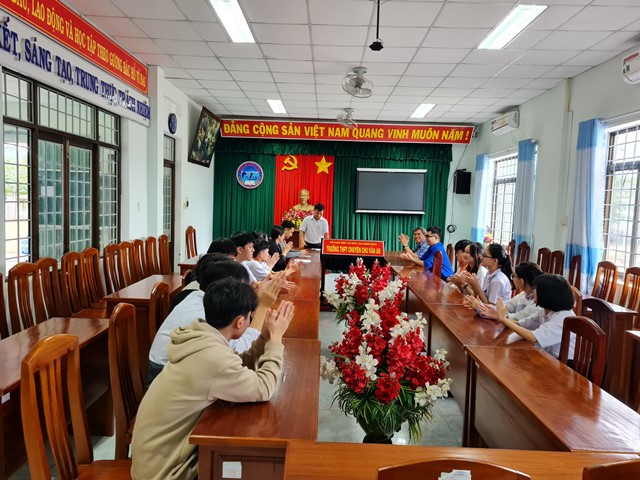 Đồng chí Phạm Ngọc Hoan, Phó Bí thư thị đoàn Hoài Nhơn (Giữa) và thầy Hiệu trưởng Dương Trọng Anh trao