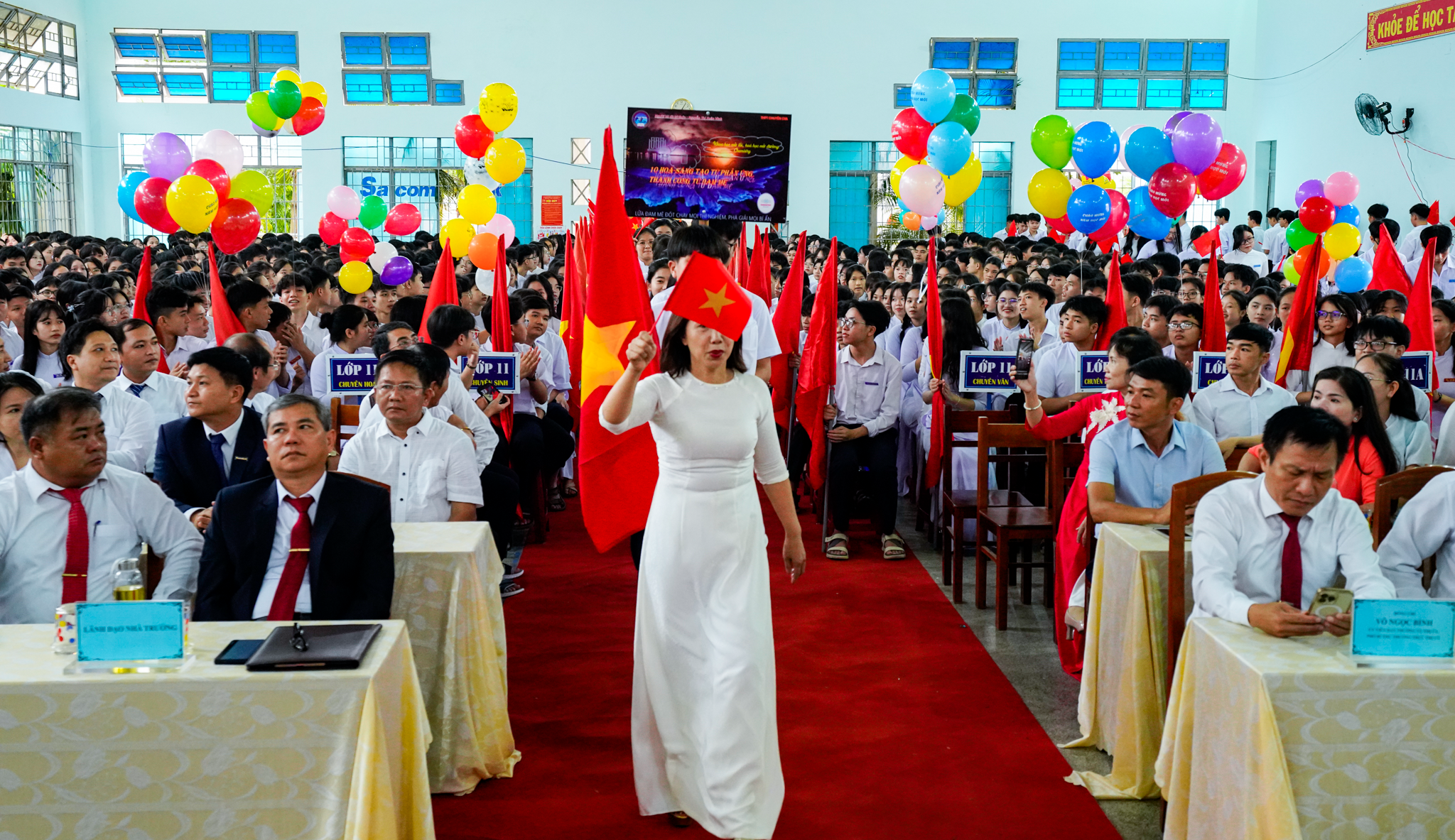Với những khẩu hiệu thân thương và cờ đỏ tung bay trên tay, thầy và trò các lớp 10 diễu hành qua lễ đài trong không khí vui tươi, phấn khởi và đầy quyết tâm trước sự đón chào nồng nhiệt của quý đại biểu, thầy cô giáo và học sinh lớp 11, lớp 12 nhà trường