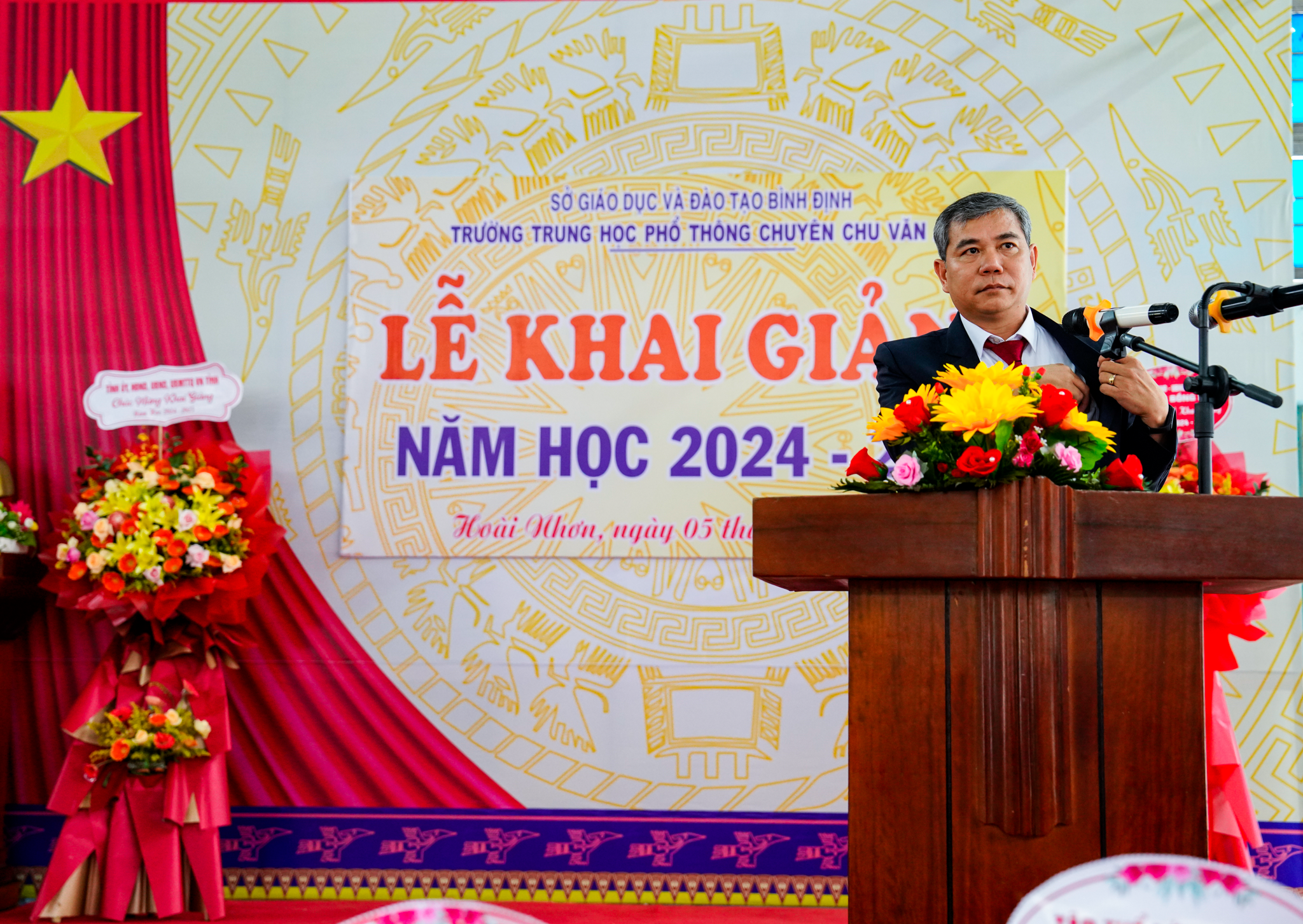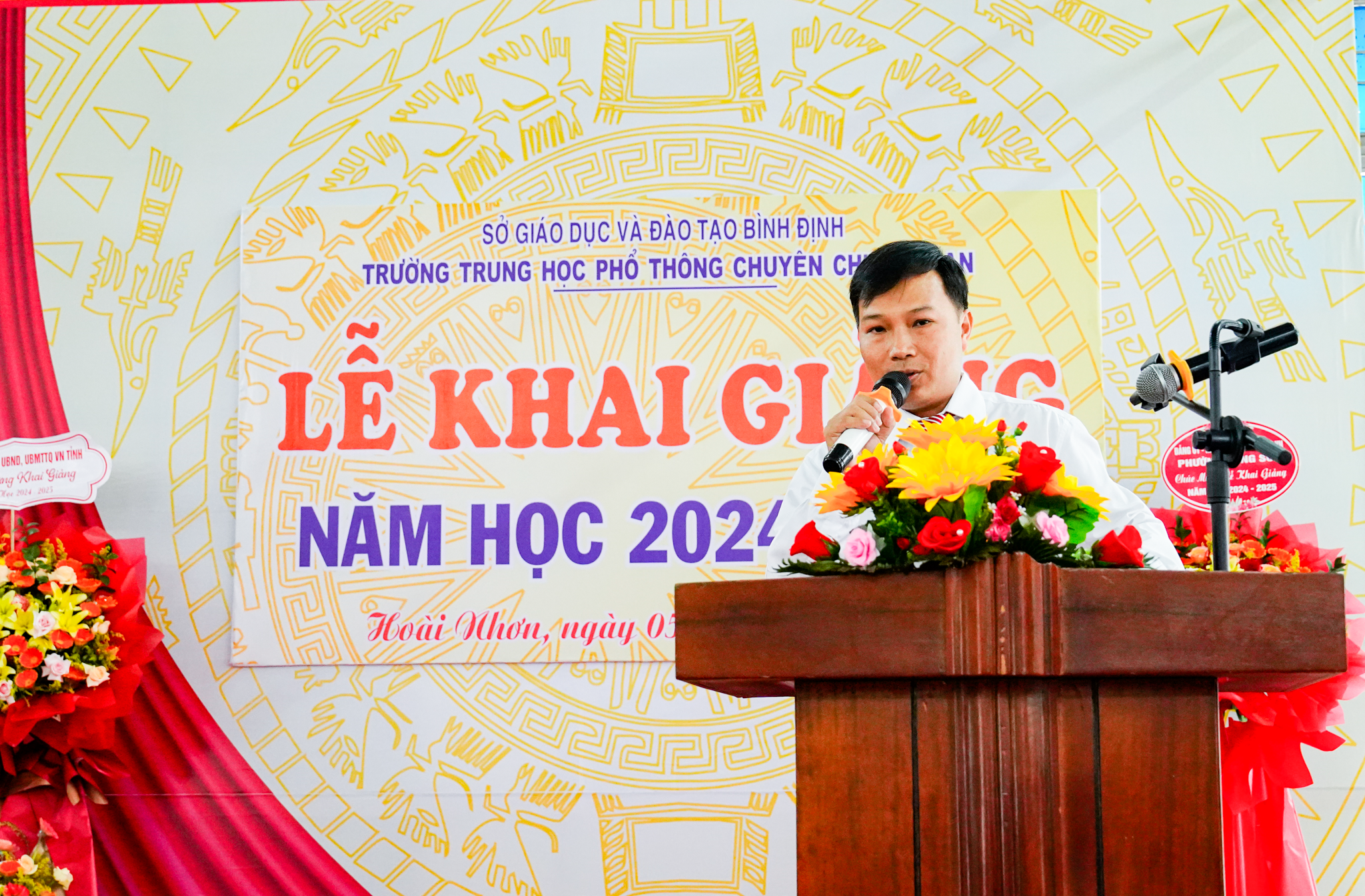 Tiếp sau bài diễn văn khai giảng, ông Võ Ngọc Bình, Ủy viên Ban thường, Phó Bí thư thường trực thị ủy Hoài Nhơn đánh trống khai giảng năm học mới 2024 – 2025.