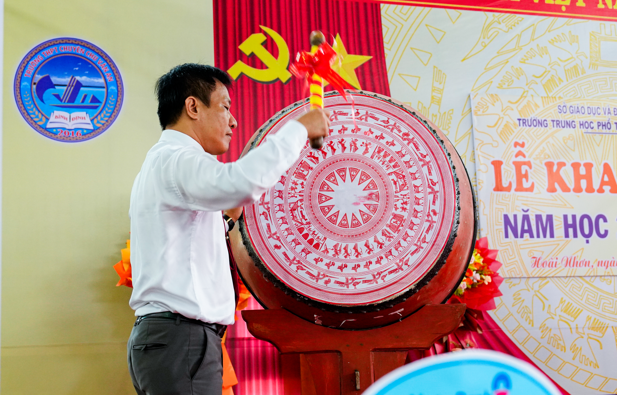 Ông Võ Ngọc Bình, Ủy viên Ban thường, Phó Bí thư thường trực thị ủy Hoài Nhơn đánh trống khai giảng năm học mới 2024 – 2025