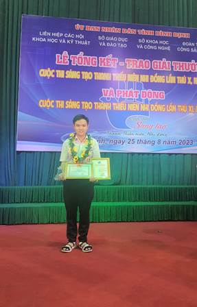 Em Lê Phước Đạt lớp 11 chuyên Hóa với giải pháp “Nghiên cứu xử lý ion Cu2+ trong nước sinh hoạt ở xã An Quang huyện An Lão bằng vật liệu hấp phụ chế tạo từ lõi ngô” đạt giải Khuyến khích.